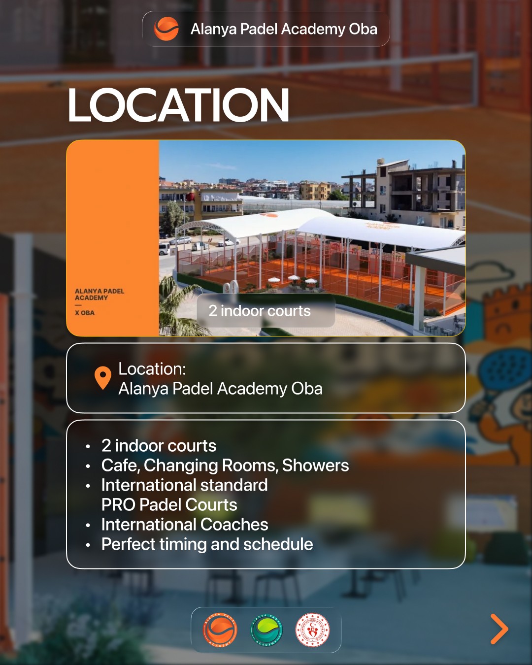 Alanya Padel Academy ObaKortlar: 2 adet kapalı (indoor) kort ve uluslararası standartlarda profesyonel padel kortları.