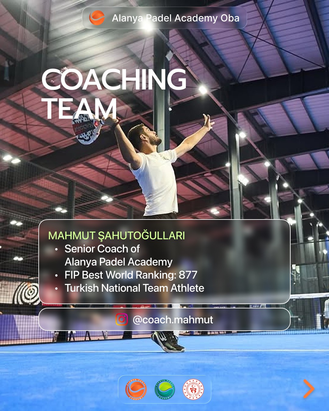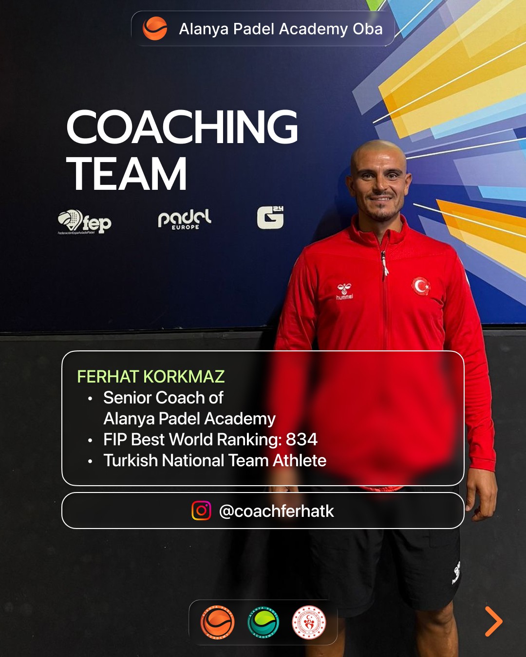 Selahattin Yazar: Alanya Padel Akademi Başantrenörü, Spor Bilimleri Yüksek Lisans, Türkiye Milli Takım Sporcusu (FIP Rank: 679).