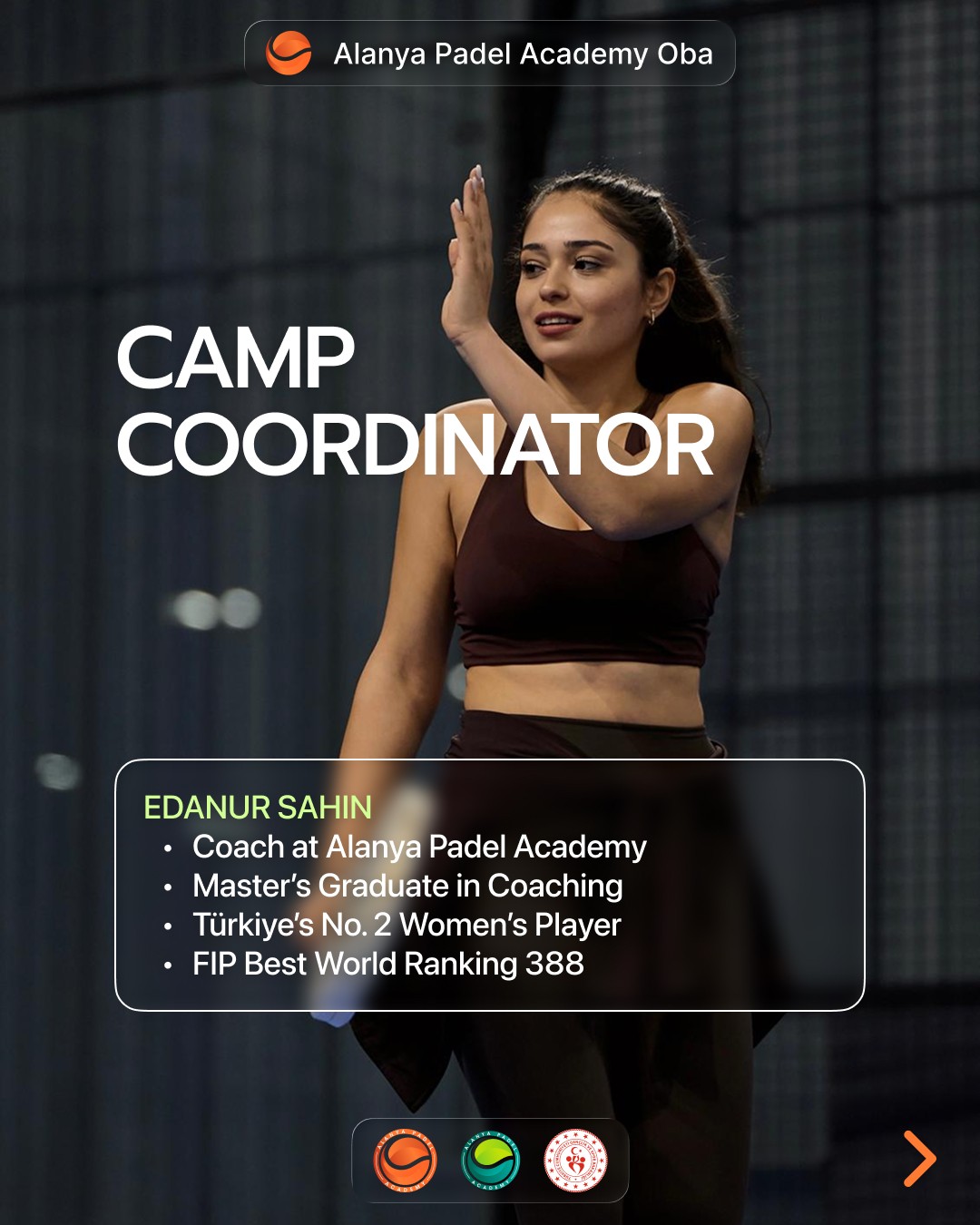 Edanur Şahin (Kamp Koordinatörü): Antrenörlük Yüksek Lisans, Türkiye Kadınlar #2, FIP Rank 388.